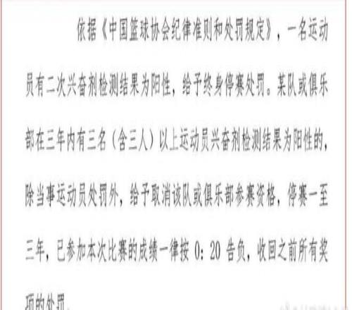 根據(jù)CBA的新規(guī)定,如果球員在2次興奮劑檢測中呈現(xiàn)陽性,將會(huì)被終身禁賽。對(duì)于球隊(duì)(俱樂部),在3年內(nèi)有3名及以上運(yùn)動(dòng)員興奮劑檢測為陽性,則取消該球隊(duì)(俱樂部)的參賽資格,禁賽期為1-3年,已經(jīng)參加的比賽全部按照0-20判負(fù),并且收回之前所有的獎(jiǎng)項(xiàng)。這樣的處罰看起來是非常嚴(yán)重的,顯示了CBA總公司和中國籃協(xié)反對(duì)興奮劑的決心,也打擊了某些球隊(duì)的違規(guī)手段和行為。