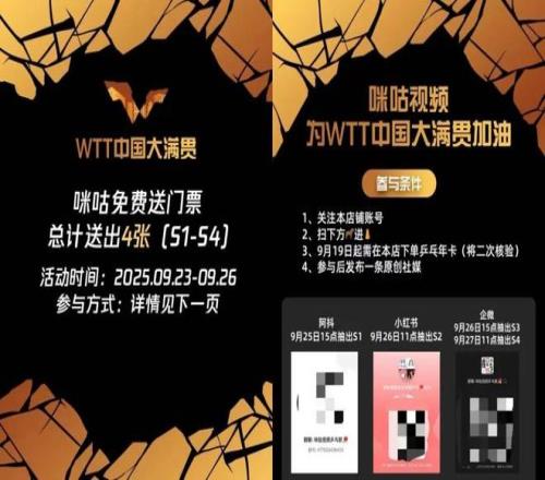 其中,WTT的官方轉播合作伙伴咪咕,深諳乒乓球迷的核心需求。在賽事籌備階段,咪咕便推出了「觀賽禮包」產(chǎn)品,將WTT門票與全站會員權益進行捆綁銷售。至于其他余票,咪咕也采用了相似的形式,球迷在官方渠道下單乒乓球年卡會員后,可以通過抖音、小紅書和企業(yè)微信在不同時間抽取門票。