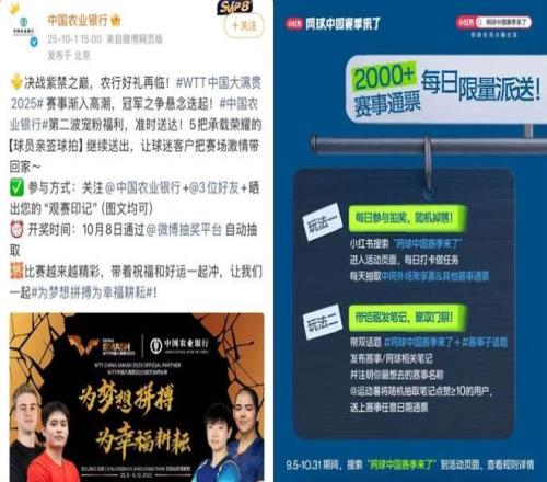 與此同時,包括庫迪、中國農(nóng)業(yè)銀行等在內的更多合作方則選擇了社交媒體互動的路徑,在小紅書、微博、抖音等社媒平臺,發(fā)布諸如「關注+轉發(fā),抽球迷送WTT門票」的活動層出不窮。