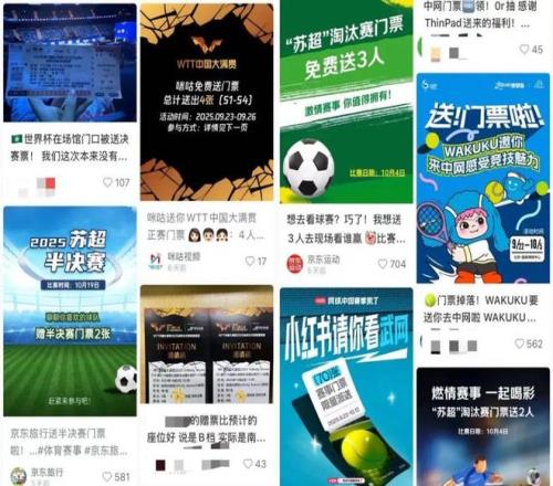 同樣地,在體育賽事運營中,也會有一定數(shù)量的球票通過不同形式被贈出。當我們在社交媒體鍵入「體育贈票」并搜索時,就會發(fā)現(xiàn)中國網(wǎng)球公開賽、上海大師賽、中超乃至此前爆火的蘇超皆有贈票活動。