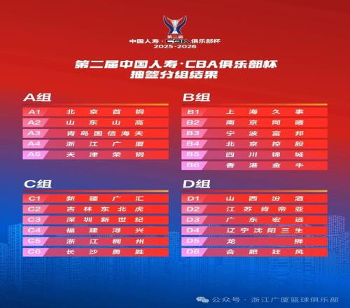 北京時(shí)間10月17日,第二屆中國人壽·CBA俱樂部杯抽簽分組結(jié)果出爐,浙江廣廈籃球俱樂部與北京首鋼、山東山高、青島國信海天以及天津榮鋼同處A組。